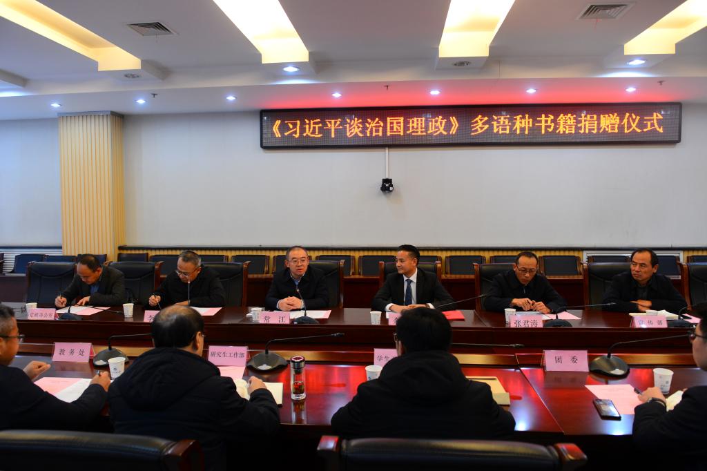 11月15日下午,《习近平谈治国理政》多语种书籍捐赠仪式在我校鄠邑校区图书馆第二会议室举行。校党委书记常江出席仪式并讲话,校党委副书记、纪委书记、监察专员李延平主持捐赠仪式。北京崇学文化发展有限公司负责人余富文向学校赠书,副校长张君涛接受赠书。