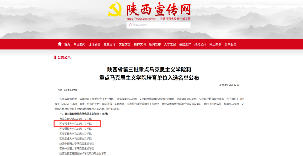 按照省委宣传部、省委教育工作委员会《关于组织开展省级重点马克思主义学院及培育单位综合评估和第三批省级重点马克思主义学院及培育单位遴选工作的通知》(陕宣字〔2025〕126号)要求,经综合评估、现场答辩、实地考察、专家综合评议等相关工作程序,并报省委宣传部部务会会议审议通过,确定了陕西省第三批重点马克思主义学院和重点马克思主义学院培育单位入选名单,我校马克思主义学院成功入选陕西省第三批重点马克思主义学院。这标志着我校马克思主义学院建设迈入了新的阶段,将在更高平台、更高层次上开启新时代马克思主义学院建设新征程。