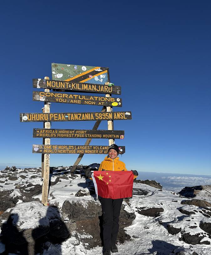 坦桑尼亚时间2026年1月6日6:20,我校校友何静成功登顶非洲之巅——海拔5895米的乞力马扎罗山。“乞力马扎罗”在非洲语里寓意着“光明之山”,何静校友以这条唯一从北坡进发的龙盖线(Rongai Route)诠释了新年“攀登光明之山”的信念。