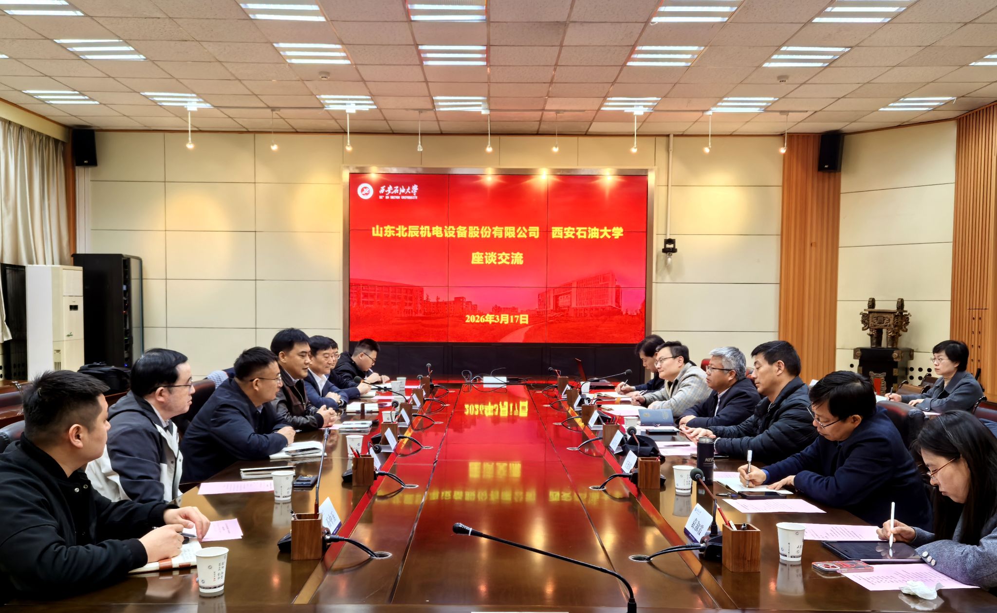 3月17日上午,山东北辰机电设备股份有限公司董事长金哲、总经理唐金山一行来我校交流座谈,会议在雁塔校区会议中心第二会议室召开。我校副校长张骁勇出席座谈会,会议由科研处副处长屈乐主持。