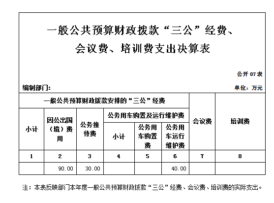 2016年度一般公共预算财政拨款安排因公出国(境)90万元,公务用车运行维护费40万元,公务接待30万元,总体与上年持平。