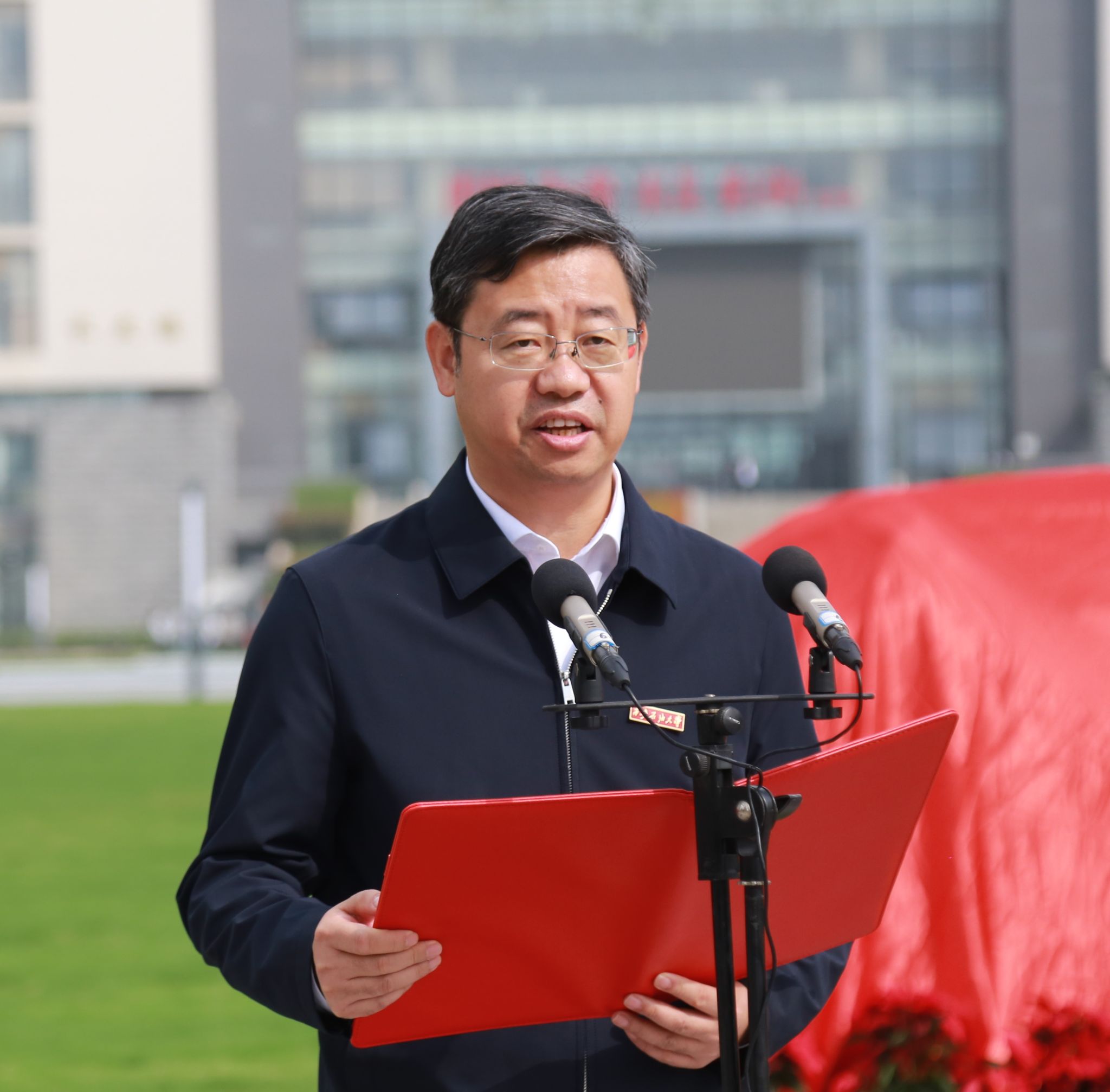 王进富首先向初心广场的捐建方和参建单位——杨小平先生、中铁十五局集团有限公司、陕西渤瞬新能源有限公司表示感谢。他指出,以“初心”命名广场,不仅是我校校园文化建设的重要里程碑,更是全体师生践行红色理想、传承石油精神和铁人精神的生动体现。广场整体庄重而开阔,兼具仪式感与实用功能,既能承载盛大的庆典与集会,也是师生日常休憩、交流思想、开展学习的开放空间。未来将矗立于广场核心区域的“新中国西北石油工业奠基人暨西北石油工业学校创建者群体雕像”,以艺术语言凝铸历史瞬间、传承精神火种,不仅是我校精神风貌的集中体现,更将成为西北地区石油文化的一座鲜明象征。他希望全校师生能充分利用好这一空间,将其作为开展思想政治教育的生动课堂和传承校园文化的重要载体,让“初心如磐、使命在肩”成为全体西石大人的自觉行动,共同为将学校建设成为高水平大学而努力奋斗。
