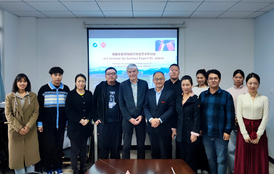 在专业交流环节,双方围绕艺术创新与国际合作展开深入对话。师生与Jaitner先生就传统音乐传承、音乐剧创作、爵士乐发展等核心议题进行了专业探讨。Jaitner先生结合国际视野提出建设性见解,为师生拓展了创作思路。会议还重点介绍了我校原创音乐剧《我为祖国找石油》,呈现音乐系在红色题材艺术创作方面的探索成果。针对师生关注的德国留学与学术交流事宜,Jaitner先生详细介绍了德国相关教育资源与文化环境,为有意赴德深造的师生提供了实用参考。