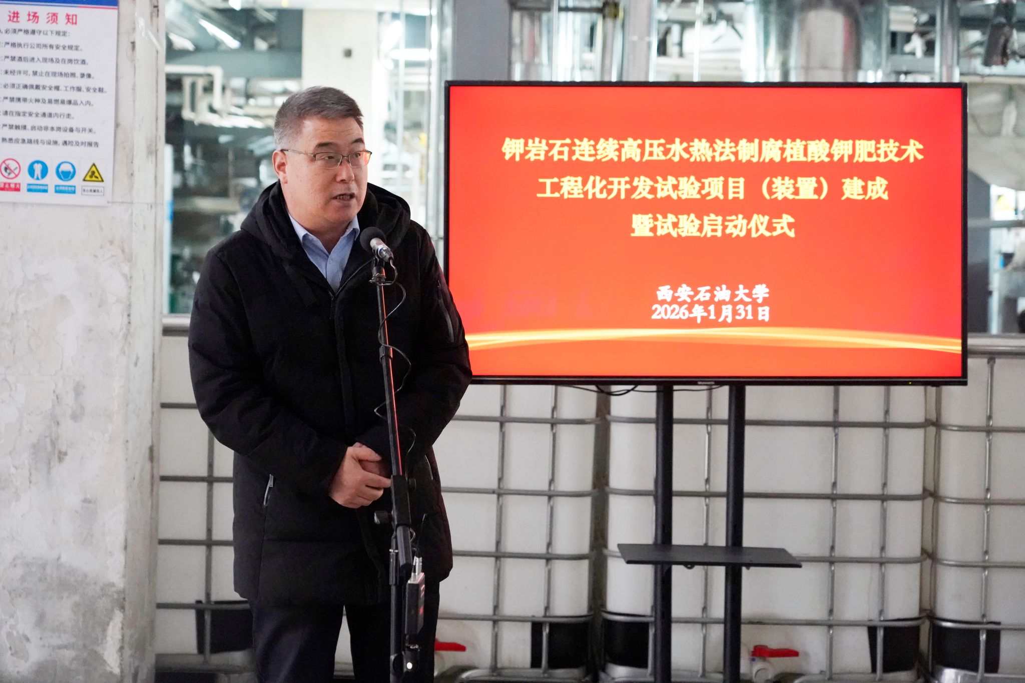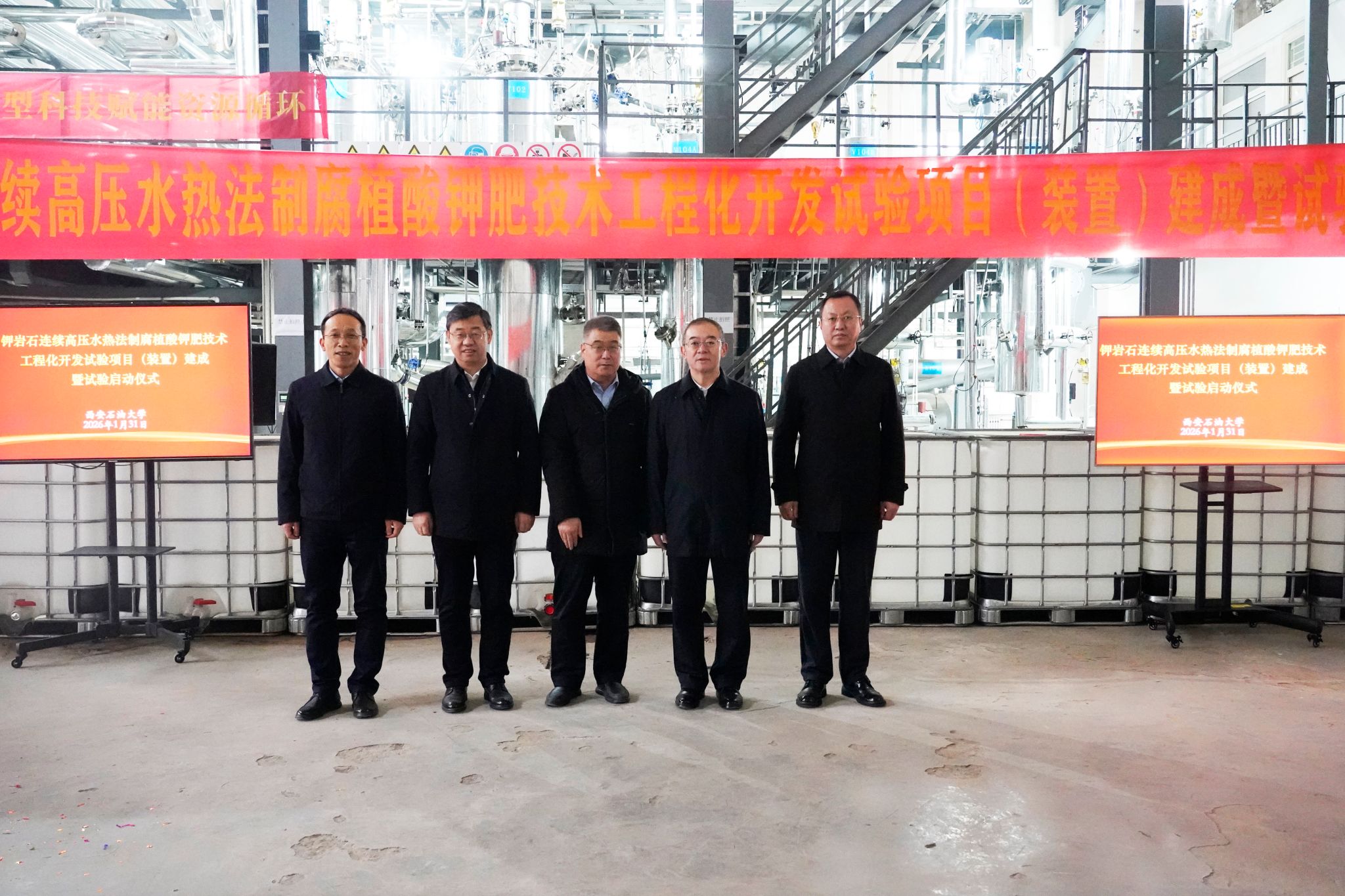 1月31日上午,西安石油大学“钾岩石连续高压水热法制腐植酸钾肥技术工程化开发试验项目”建成暨试验启动仪式在鄠邑校区如期举行。校党委书记常江、校长王进富、副校长张荣军出席仪式,项目联合科研团队负责人、承建单位代表以及学校相关职能处室负责人参加活动,共同见证项目落成投试的重要时刻。仪式由副校长张君涛主持。